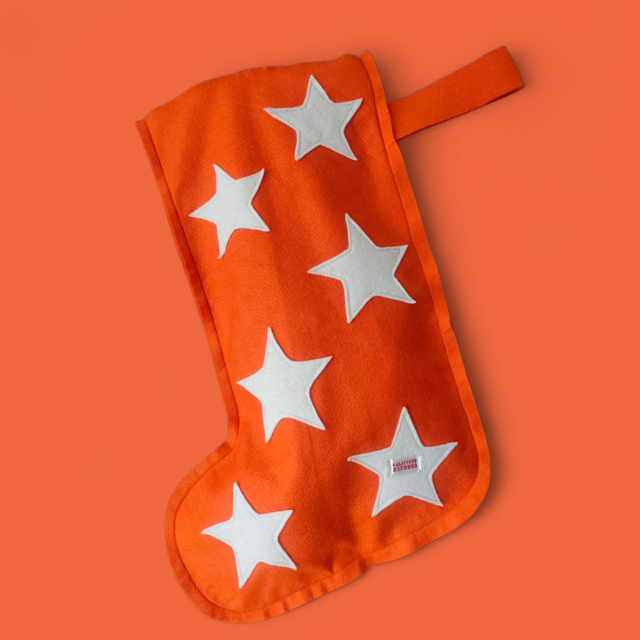 Φτιαγμένη με αγάπη από μαλακή φετρίνα σε ζωηρό πορτοκαλί χρώμα και διακοσμημένη με χειροποίητα λευκά αστέρια,